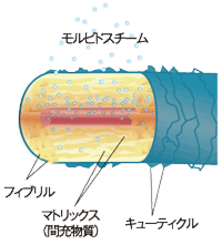 この微粒子スチームが、毛髪内部に入り込み、コルテックス内のミクロフィブリル繊維のすき間に水が浸透します。 |